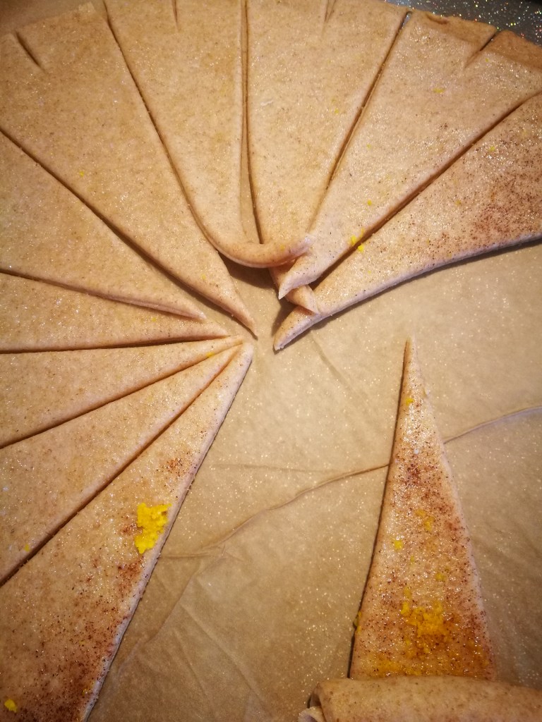 Stendere ogni panetto e spennellare con olio e spolverizzare con un poco di zucchero, cannella e buccia di arancia grattugiata. Sovrapporre i dischi uno sopra all’altro; stendere nuovamente a formare un grande cerchio , tagliare 16 spicchi che andranno arrotolati per formare i cornetti.