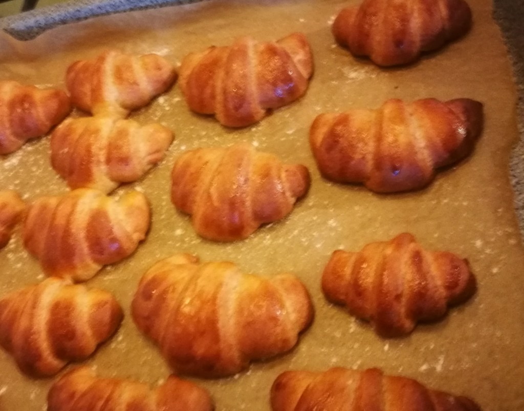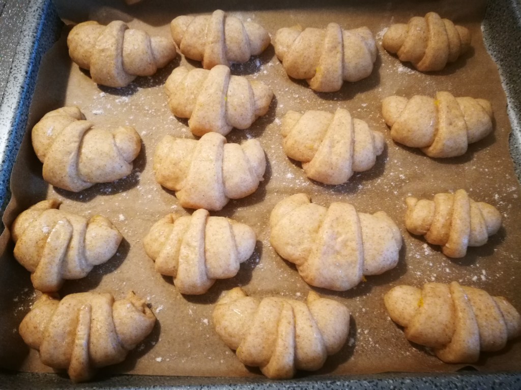 - Lievitazione fino al raddoppio del cornetto. Spennellare con una miscela di tuorlo d’uovo e latte; Cottura in forno a 180 gradi per circa 15 minuti.